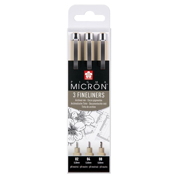 Pigma Micron 02 (0,3 mm), Pigma Micron 04 (0,4 mm), Pigma Micron 08 (0,5 mm).